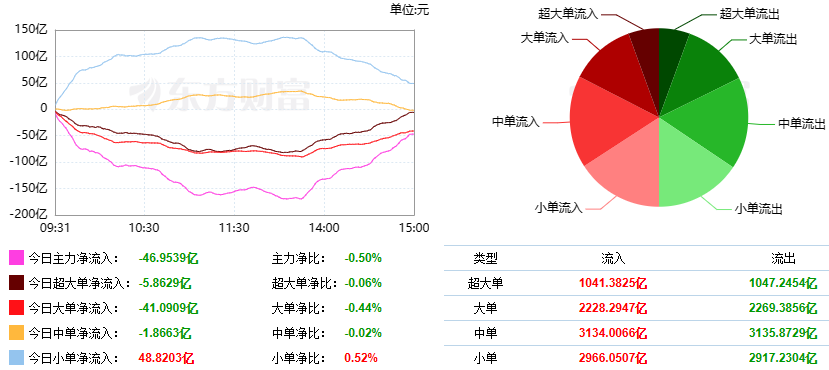 根据东财统计,截止收盘沪深两市呈现资金净流出状态,当日沪深两市资金当日沪深两市资金共流出46.95亿元。其中,超大单净流出5.86亿元,大单净流出41.09亿,中单净流出1.87亿元,小单净流入48.82亿元。