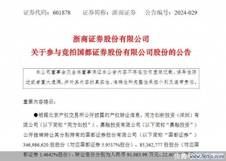 据北京产权交易所公开披露的产权转让信息,同方创投、嘉融投资公开挂牌转让其分别持有的国都证券3.47亿股股份(对应国都证券5.9517%股份)、8536.28万股股份(对应国都证券1.4642%股份),转让底价分别为9.11亿元、2.24亿元;同方创投和嘉融投资的前述挂牌转让为捆绑转让,合计转让国都证券股份比例为7.4159%。